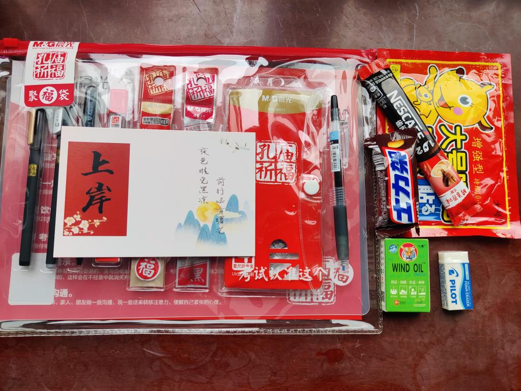 随后老师们为大家发放学院为同学们精心准备的考研礼包,这份暖心礼物中包含了考试用品十三件套、御寒的暖宝宝、提神醒脑的清凉油、能量补给零食、以及祝福莘莘学子金榜题名的贺卡。体现了电信学院全体领导、老师对学子们的热诚关怀和殷切期待,希望能让身处紧张备考氛围中的大家感受到来自学院的关爱和温暖。收到礼物的同学纷纷感谢学院领导和辅导员老师们的关心,表示会积极认真备考,全力以赴,不辜负自己的辛勤付出,也不辜负学院以及老师们的殷切期望。