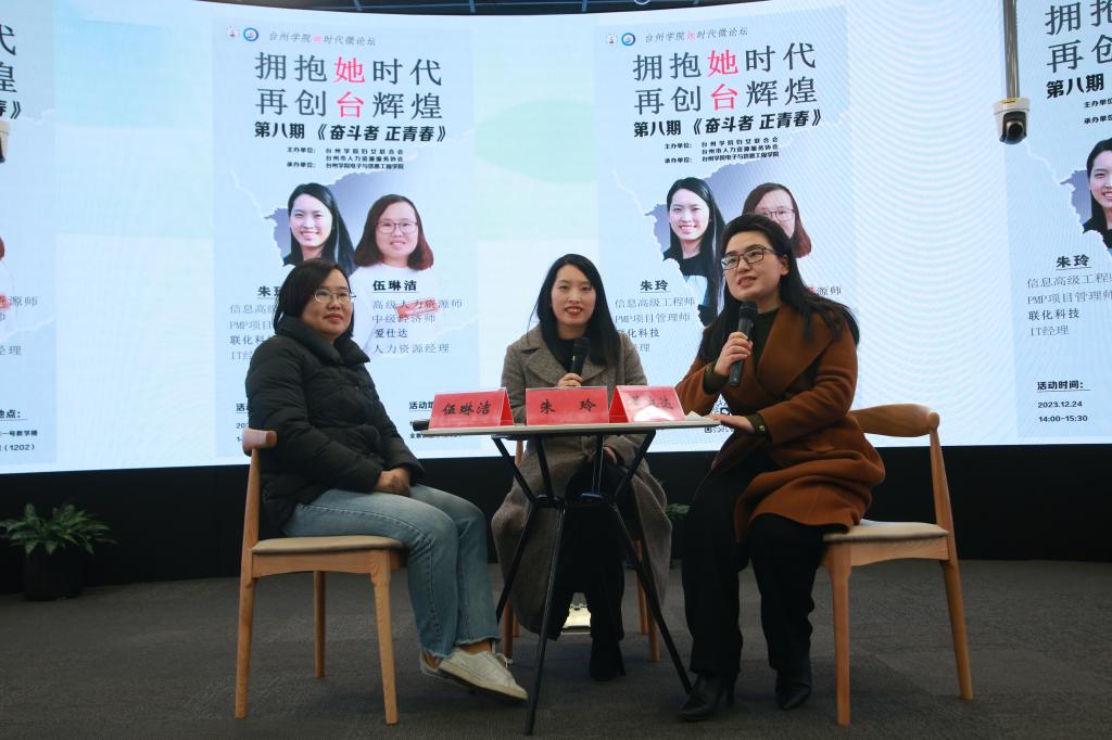 12月24日,学校在1号教学楼全景教室举办第八期“她时代”微论坛,邀请了联化科技IT经理朱玲、爱仕达股份有限公司人力资源经理伍琳洁作《奋斗者,正青春》主题分享。校妇联副主席、国际交流与合作处副处长、国际学院副院长王爱琴,台州市人力资源协会副秘书长柏余红和电子与信息工程学院党委副书记董立达出席会议,电子与信息工程学院50余名师生代表参加活动。