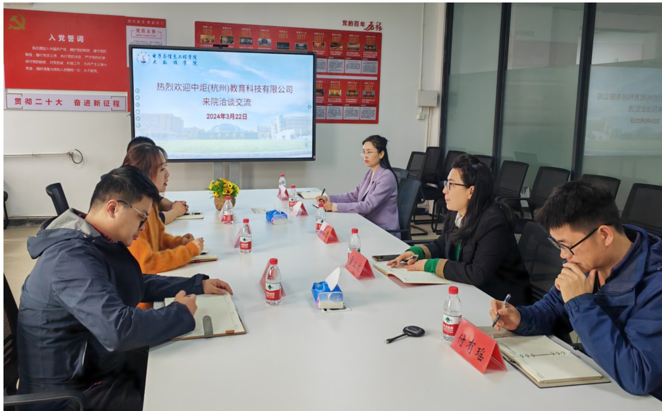 为加强校企合作,拓宽毕业生就业实行渠道,推动学院毕业生高质量实习就业,3月22日,电信学院邀请中炬(杭州)教育科技有限公司来校交流洽谈。学院党委书记王奎东、副书记董立达以及相关系室主任、辅导员参加。