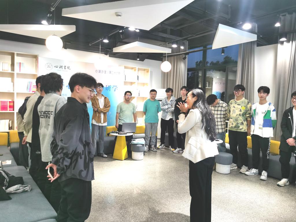 董立达首先对李敏老师进行了介绍,对她的到来表示了感谢。活动正式开始后,李敏老师带领大家做了“我是谁”的暖场小游戏,同学们迅速拉近了距离,熟悉了彼此,现场氛围热烈、活泼,沙龙在同学们的欢笑声中正式开始。李老师从“什么是亲密关系?”开始,通过精心准备的PPT,层层深入,引导同学们分享了各自对于亲密关系和亲密关系中倾听的定义和看法。接着,李老师引出了“亲密关系能带给你什么、亲密关系中的误区、如何进行亲密关系中的互动”等问题,同学们纷纷结合自身经历交流了在与亲人和恋人相处中遇到的困惑和困扰,李老师引导其他同学给出了分析和建议,李老师做最后总结。在不同观点的碰撞中,同学们时而思索、时而点头、时而微笑,有疑惑的同学表示豁然开朗,有想法的同学得到了鼓励和肯定。最后,同学们分享了在此次心理沙龙上的收获和感悟,他们表示,在亲密关系中,维持关系的平衡、换位思考和改变自己是拥有健康、治愈的亲密关系的关键。大家纷纷表示,这次活动形式新颖,内容丰富,促进了自我探索,加深了自我认识。活动在合影留念中落下帷幕。