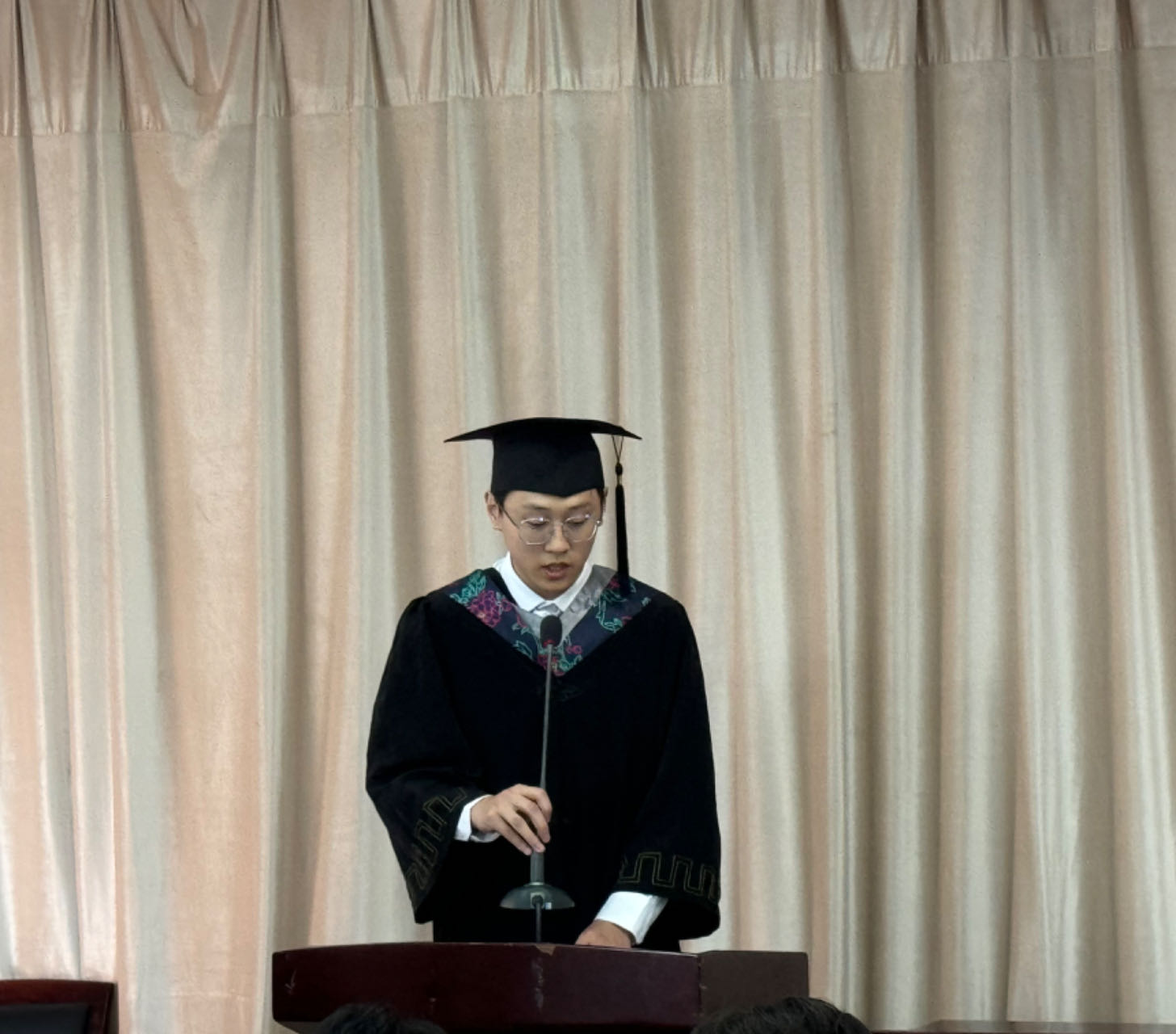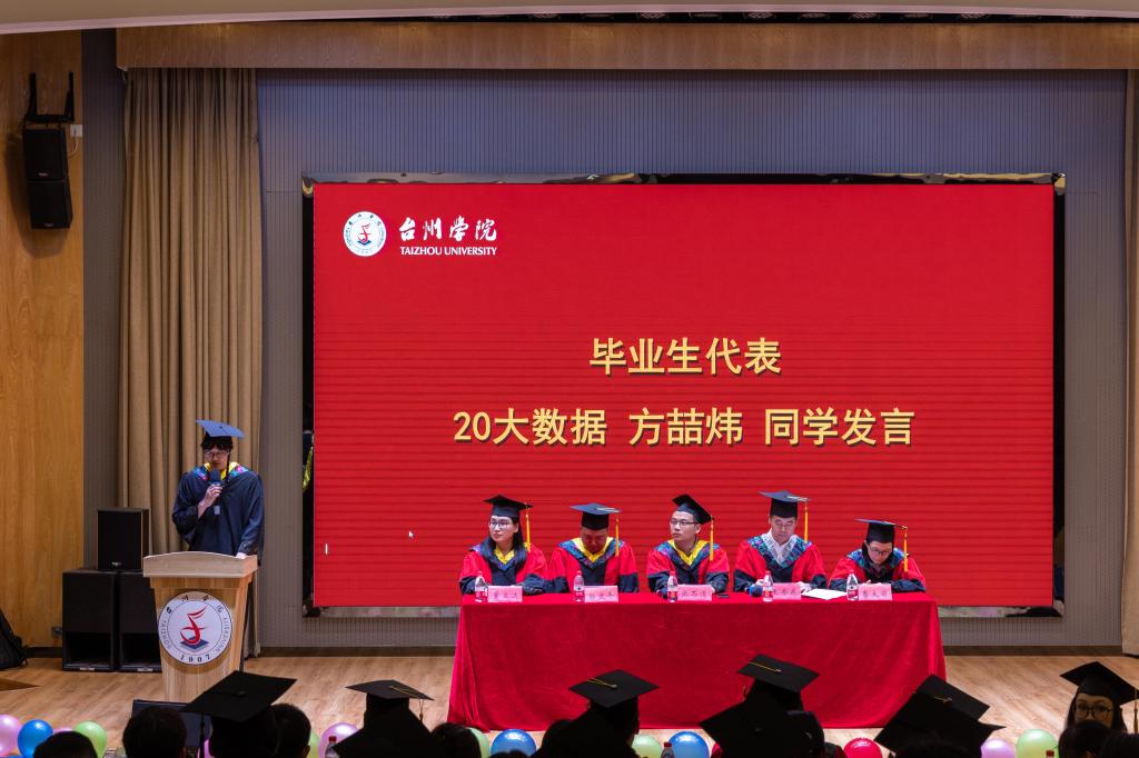 毕业生代表曾日威、方喆炜回顾四年大学校园生活,代表全体毕业生表达了对专业老师和辅导员的感激,对学生的留恋和对未来生活的期许。