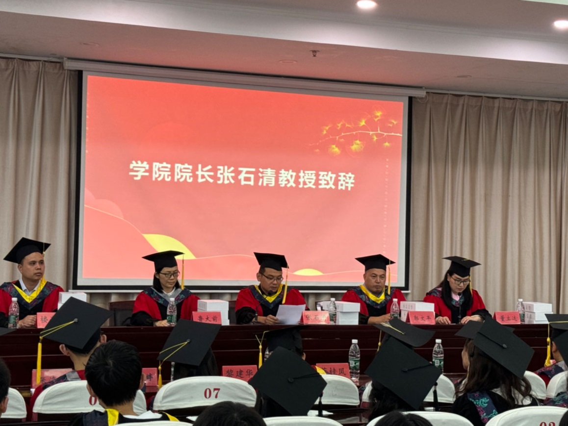 院长张石清代表学院向2024届全体毕业生圆满完成学业表示祝贺,向长期以为学生成长成才辛勤付出的各位老师和家长,致以最崇高的敬意。同时以一名师长的身份提出三点与其共勉:一是要守之以德,永葆鲜亮的人生底色;二是要起而行之,在追求卓越中绘就壮美人生;三是要懂得自爱,用爱去感知眼前的幸福。并最后鼓励同学要一如既往地关心支持母校的发展,常回母校看看。