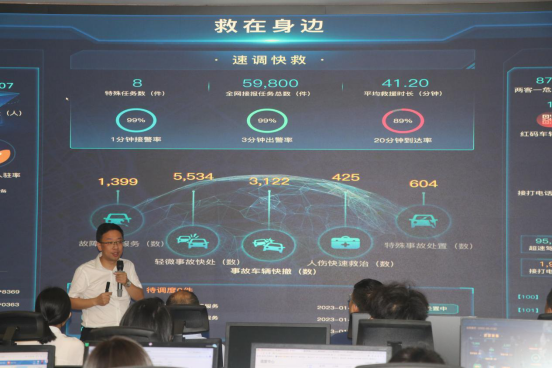 工作推广会短片介绍了公司发展历程。“救在身边”项目以资源聚集、快速调度、主动防御为核心,涵盖故障车辆服务、轻微事故快处、事故车辆快速撤离、人伤快速救治、特殊事故处置五个子场景,旨在整合社会资源和政府资源,为城市道路救援提供高效支持。