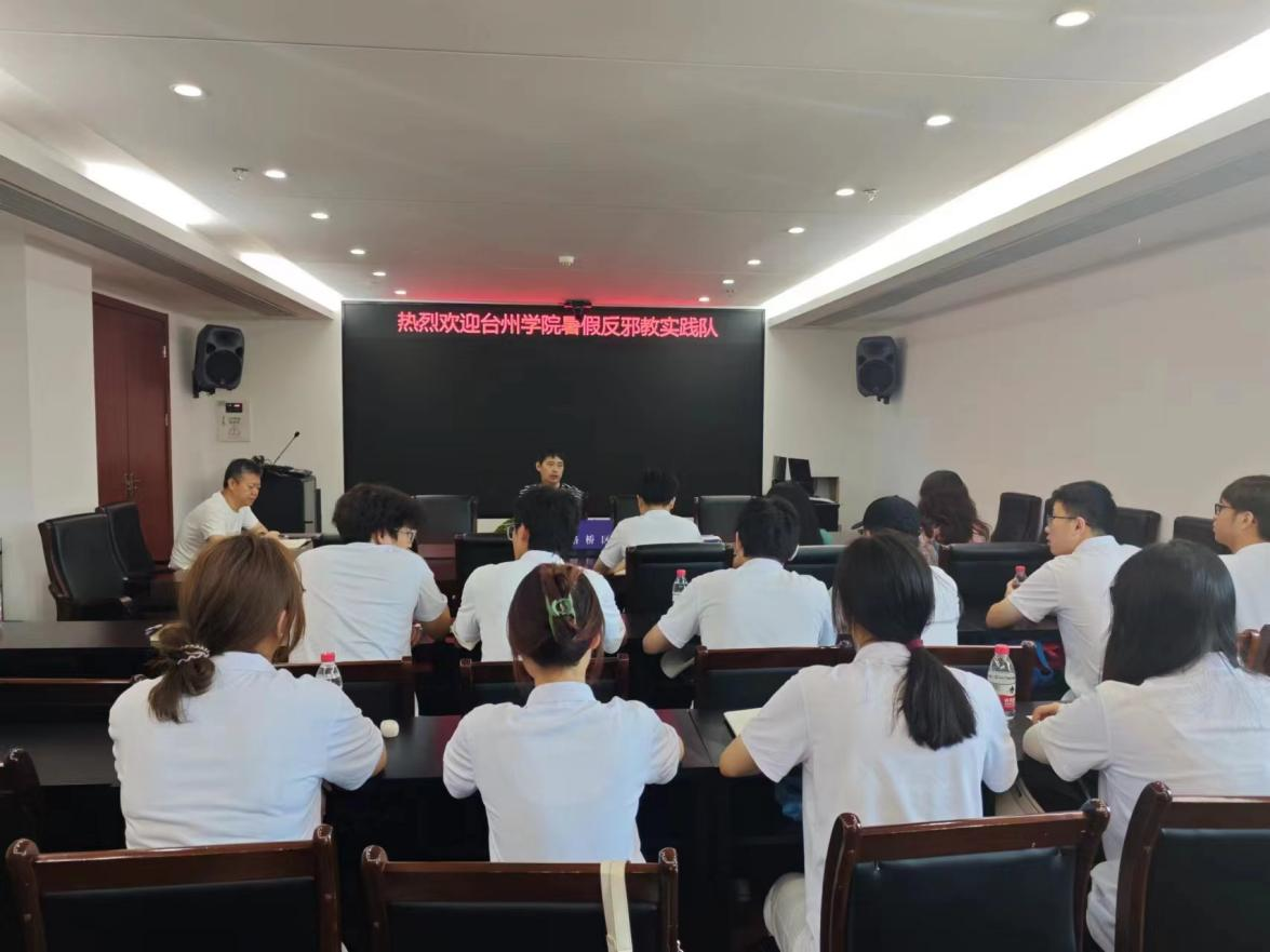 7月4日上午,实践队来到了台州市路桥区人民政府参加反邪教专题会议讲座。参与讲座的有路桥区委政法委委员汤建斌、区反邪教协会副理事长兼秘书长王祖增、区平安创建中心副主任罗利红和实践队全体成员,讲座由路桥区委政法委委员汤建斌主持。讲座上汤委员就邪教种类、国内外邪教产生原因以及路桥区现反邪工作现状进行详细讲解。讲座尾声,实践队员就实践过程中遇见的问题进行了提问,汤委员耐心详细解答,为接下来三天在路桥的实践活动有序开展奠定基础。