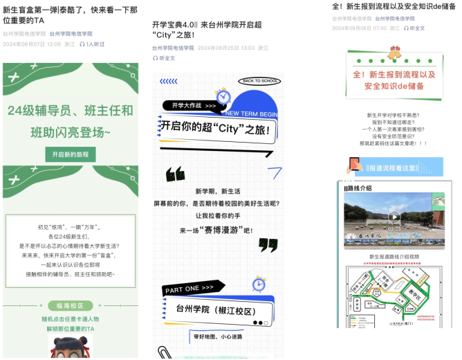 数字迎新,热闹非凡。学院通过官方微信平台为新生们准备了“虚拟校园游”“在线礼品包”“班主任、班助介绍”“新生数据概览”“校园安全小提示”等一系列迎新主题宣传,帮助新生们更好地融入大学生活,领略校园风采。