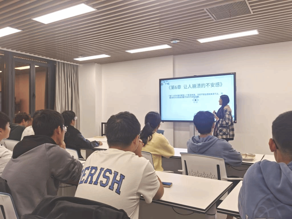 在谈到书中有关“如何与坏情绪相处”的章节时,同学们分别结合书中的内容,对“惊恐症”、“强迫症”和“生活中的伤痛”的看法以及应对经验进行了分享。在分享到书中有关“如何善待坏习惯”章节时,两位同学分享了他们对于“性与爱”、“减肥和酗酒”问题的看法,他们认为这些问题其实与当今“快节奏、高压力”的社会环境有关,同学们需要反思这个时代对个体的影响,摒弃单一的审美标准和不健康的生活方式。最后一名同学给大家带来了最后章节“勇敢改变,坦然接受”的阅读感悟,他分享道:要想获得幸福人生,就要有敢于面对困难的勇气,努力改变那些可以改变的,接纳那些不能改变的。