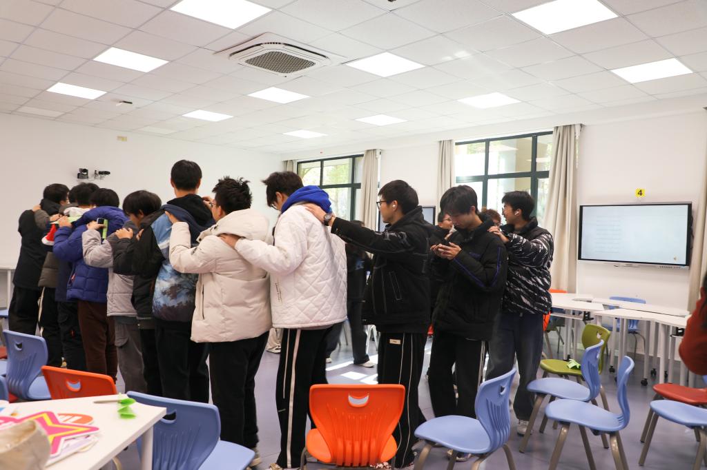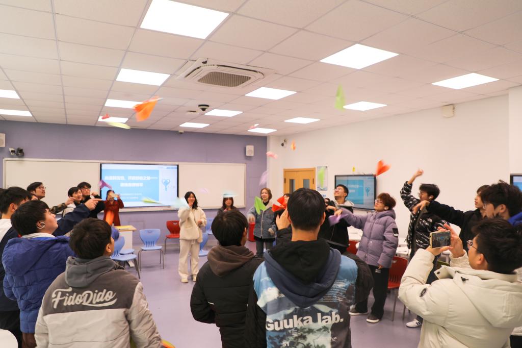 简单开场介绍后,“大风吹”和“进化论”两个团体小游戏登场,欢声笑语瞬间充满了整个教室,同学们原本紧绷的神经得到了极大的放松,现场气氛也变得热烈而欢快。随着轻松氛围的营造,刘老师话锋一转,引导同学们深入思考近期感受到压力的事件。随后,她发放不同颜色的“冰山图”,同学们纷纷将压力事件、对压力的错误信念以及应该建立的正确信念等信息认真填写其中。相同颜色纸张的同学组成一组,分享各自的“冰山图”,并由小组代表进行交流发言,同学们之间的理解与支持在分享中悄然生根。互动环节中,每位同学将手中的纸张折成纸飞机放飞。纸飞机在空中交错飞翔,如同同学们交织的思绪与情感。大家随机捡起地上的纸飞机,为原主人写下真挚的话语,再折回放飞,如此循环往复。最后每个人拿回自己的纸飞机,展开阅读同伴们写下的暖心鼓励时,整个活动达到了高潮,大家对彼此的温暖、支持感动。活动过程中,同学们聆听了不同的“抗压故事”,在刘老师的巧妙引导下,相互诉说、倾听、鼓励与欣赏,彼此的心灵距离被进一步拉近。活动尾声,刘老师带领同学们玩起了“圆圈按摩”小游戏,同时,屏幕上亮起自我鼓励的话语,在朗读声中,同学们强化着心中积极的信念,为这次心灵减压活动画上了圆满的句号。