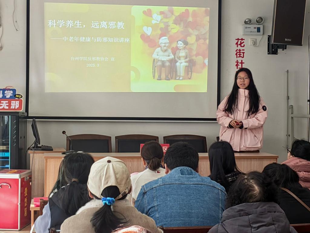 多方联动,共筑反邪防线。活动伊始,临海市反邪教协会副理事长周贤正发表开场讲话,强调反邪教工作对维护社会稳定的重要意义,并呼吁居民增强防范意识,共同抵制邪教侵蚀。花街社区居委会代表详细介绍了花街社区的人口情况、反邪工作成果。