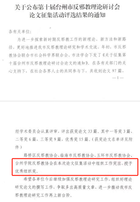 台州学院反邪教协会被授予论文征集优秀组织奖