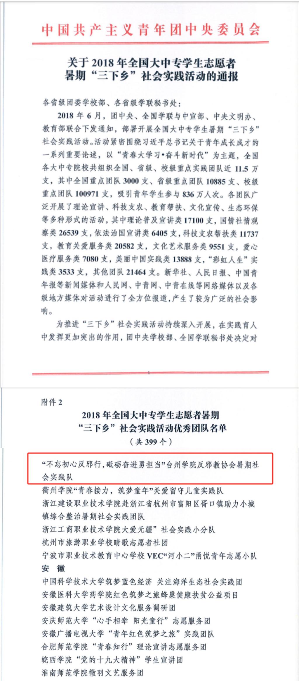 反邪教协会暑期社会实践队获“三下乡”优秀团队