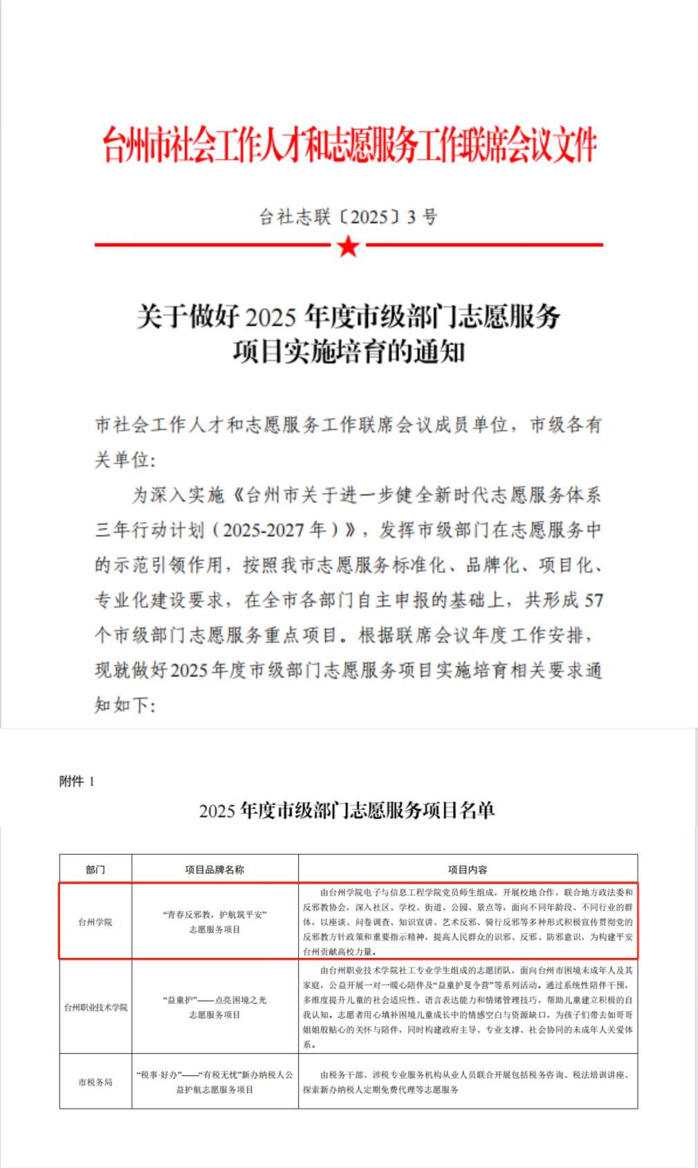4月7日,台州市社会工作人才和志愿服务工作联席会议发布《关于做好2025年度市级部门志愿服务项目实施培育的通知》,我校反邪教协会“青春反邪教,护航筑平安”青年志愿服务项目,荣获2025年度台州市级部门志愿服务重点项目。