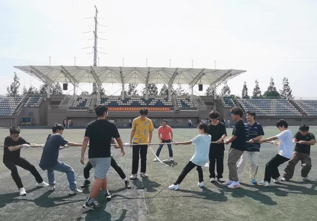 “力量联盟”游戏即拔河比赛成为力量与团结的试金石。随着哨声响起,参赛队员紧握长绳、身体后倾,齐心协力向同一方向发力。辅导员们在旁化身“最强应援团”,呐喊助威声此起彼伏,将现场气氛推向高潮。