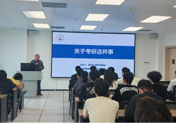 最后,郭文平针对考研学生作专题报告,深入剖析当前就业环境趋势,分享院校选择策略、科学备考步骤及高效复习经验,并通过优秀“上岸”案例激励学生。他寄语全体考研学子坚定信心,以扎实行动迎接挑战。