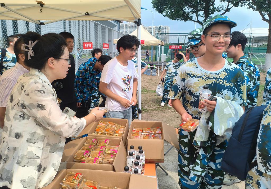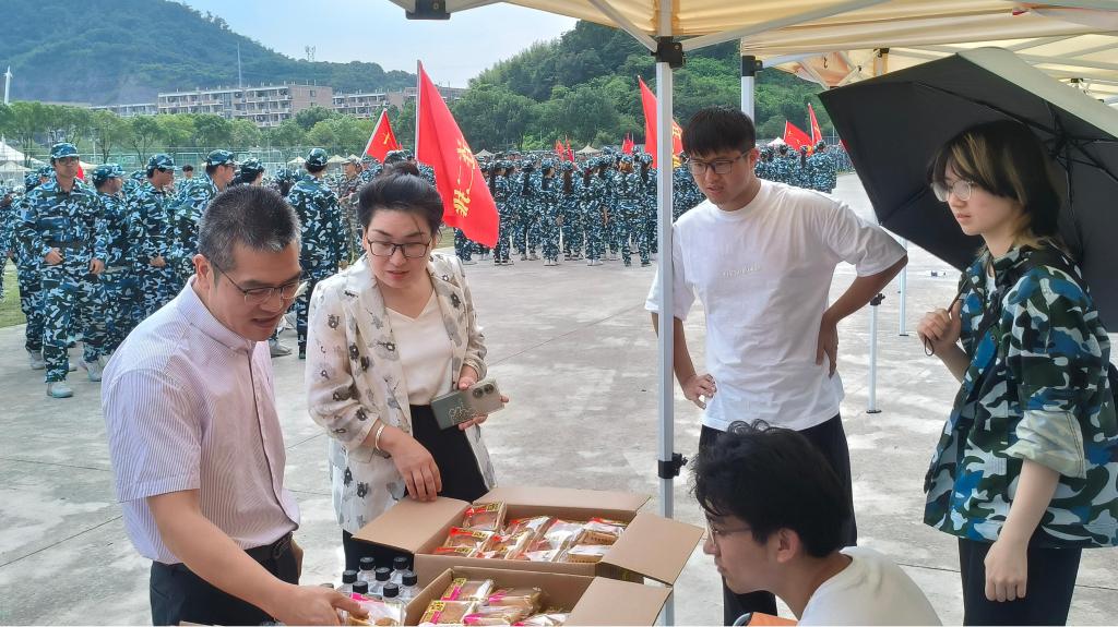 训练场上,新生身着迷彩服专注训练。曹仁海书记亲切问候:“同学们辛苦了!希望这份心意能让大家在军训中感受家的温暖。” 董立达副书记分发物资时,关切询问新生适应情况,叮嘱大家珍惜军训时光,锤炼意志。