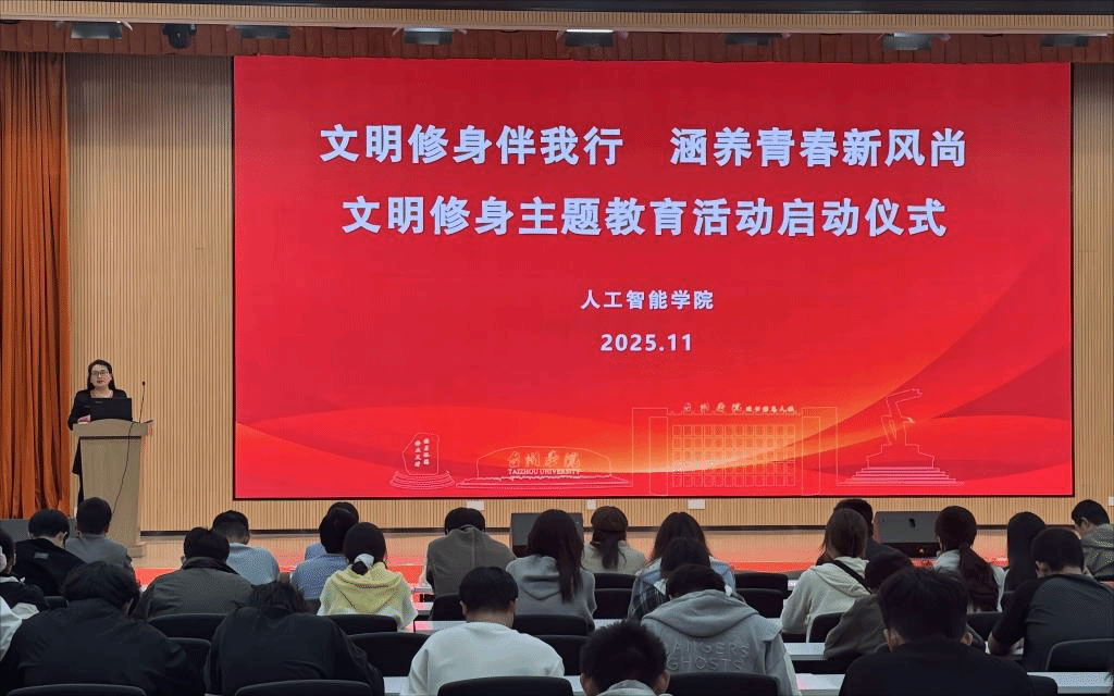 为深入贯彻立德树人根本任务,引导学生坚定理想信念、锤炼品德修养、塑造文明风尚,11月6日下午,人工智能学院在椒江校区科技综合楼328报告厅举行文明修身主题教育活动启动仪式。学院党委副书记董立达出席仪式并作动员讲话,各年级辅导员、主要学生骨干及学生代表共同参加。