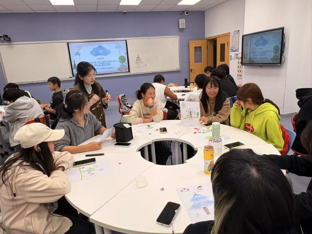 接着,她让同学们将自己想象成一棵树进行绘制并分享创作思路。有人绘制根系发达的榕树,借此强调内心的安全感;有人描绘开花结果的果树,寄托对成长与收获的期待。画笔将抽象的自我认知具象化,通过分享,同学们逐渐加深对彼此的了解。