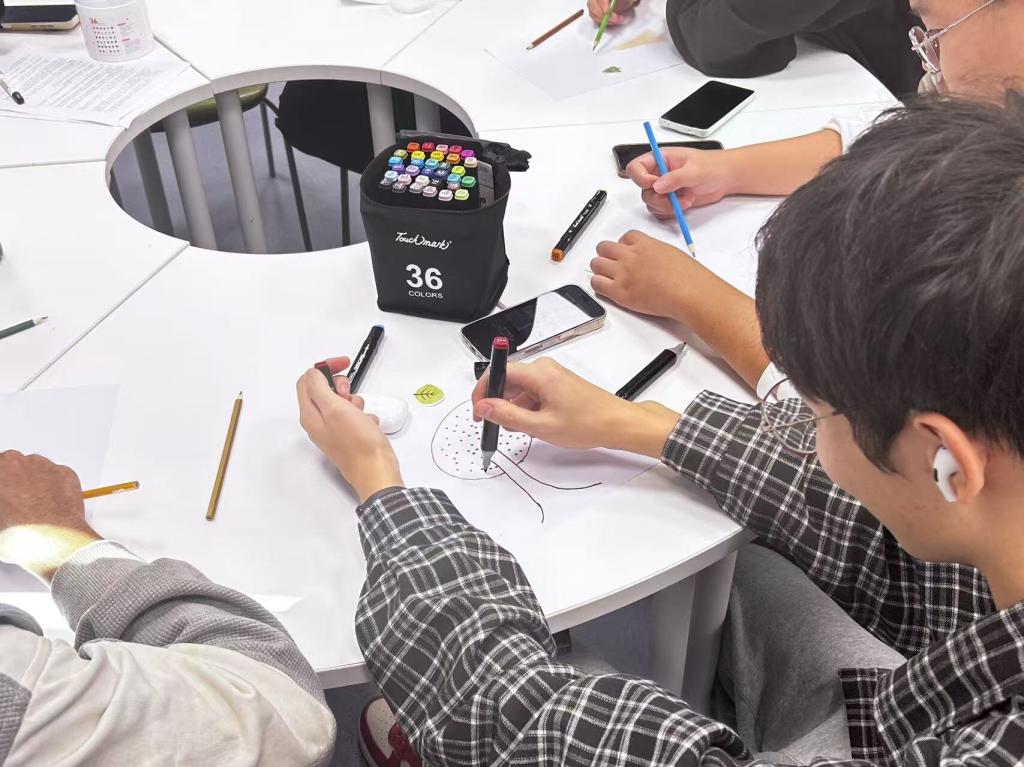 紧接着,活动进入高潮——小组共创“集体森林”,各小组需将成员笔下“个性鲜明”的树融入同一画面。同学们围坐商讨,在充分沟通、适度妥协与创意碰撞后,通过凝聚的集体智慧顺利完成各组的“集体森林”。