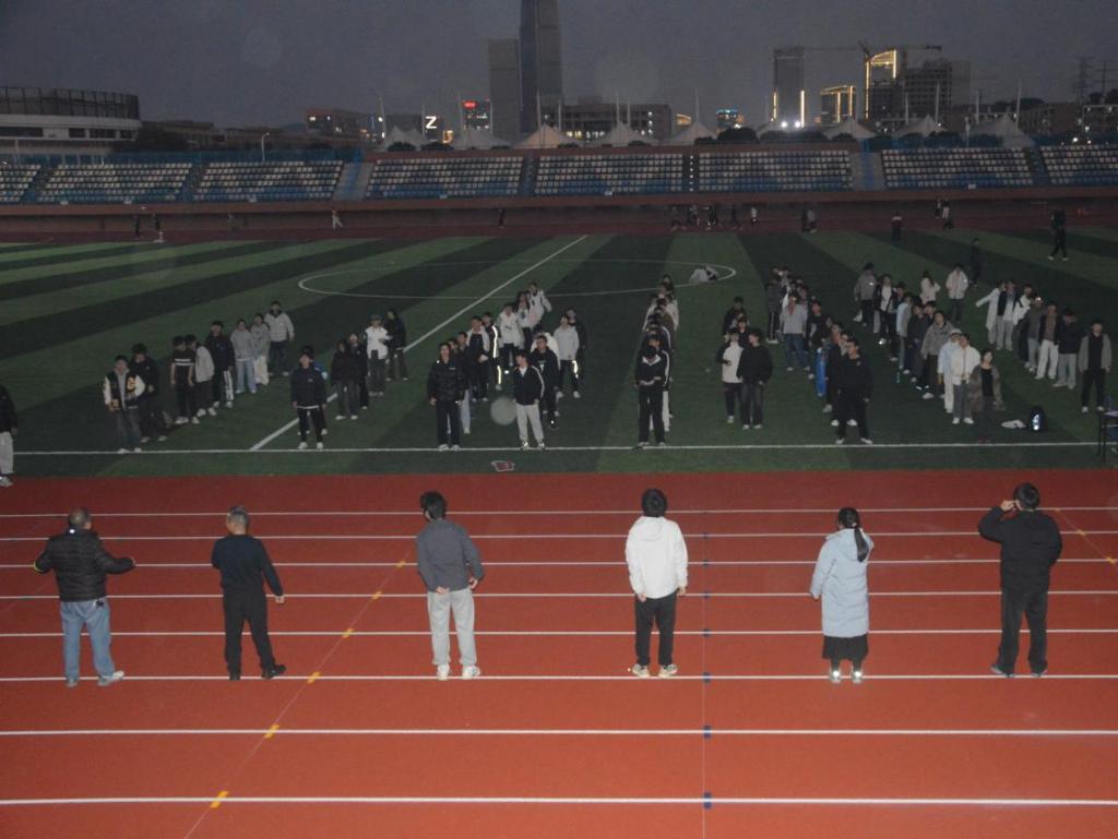 热身环节中,团学会体育部同学带领全体参与者进行了系统的拉伸准备,从头颈、肩部到四肢,科学指导大家充分活动身体,有效预防运动损伤。同学们积极响应,跟随节奏舒展身体,欢声笑语中逐渐活动开关节、预热了肌肉,为接下来的夜跑做好了充分准备,也进一步凝聚了现场的运动氛围。