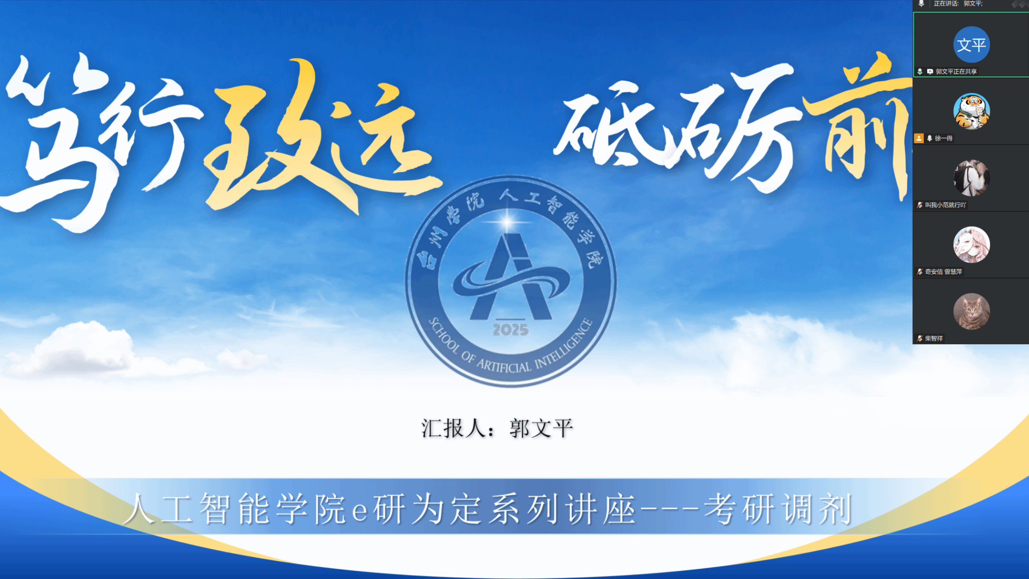 为切实帮助考研学子把握调剂关键节点,明晰调剂流程要点,破解志愿填报困惑,全力助力每一位考生圆梦上岸,4月3日和4月9日,人工智能学院“e研为定”第16期考研调剂解答专题指导线上活动分两次如期开展。学院副院长郭文平、毕业班辅导员及有调剂需求的学子共同参与本次活动,围绕调剂政策、志愿选择、复试准备等核心内容展开深入交流,为学子们搭建起精准高效的调剂指导平台。