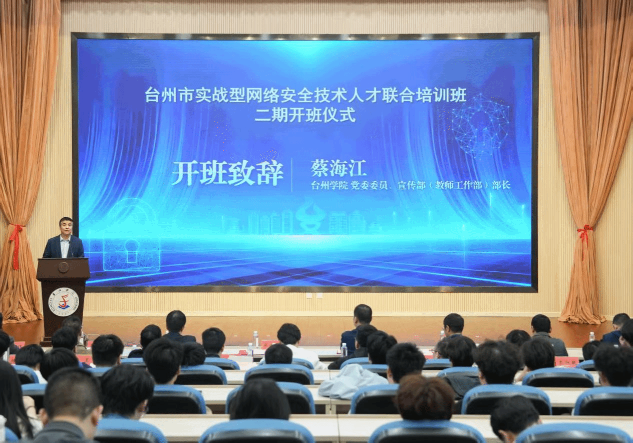 蔡海江在致辞中代表台州学院向与会领导、企业专家及通过严格选拔的二期学员表示热烈欢迎。他指出,本次联合培养班在课程设计、导师配备及实战资源上进行了全面升级,学员将直接参与实际企业安全项目,完整体验从漏洞扫描、安全评估到应急响应的全流程工作。他寄语学员以空杯心态钻研技术,努力成长为“精技术、懂战术、有视野”的复合型网安人才。