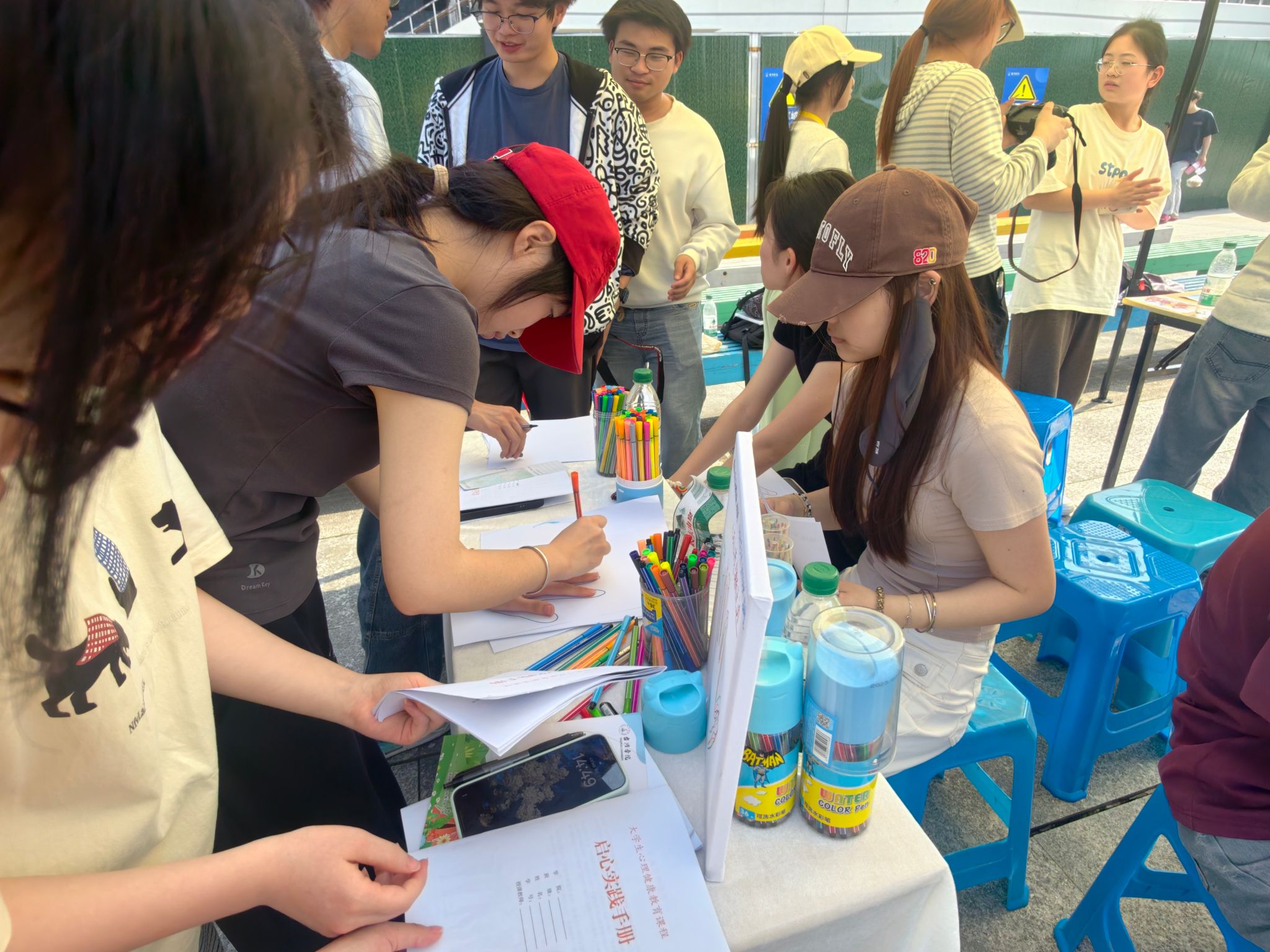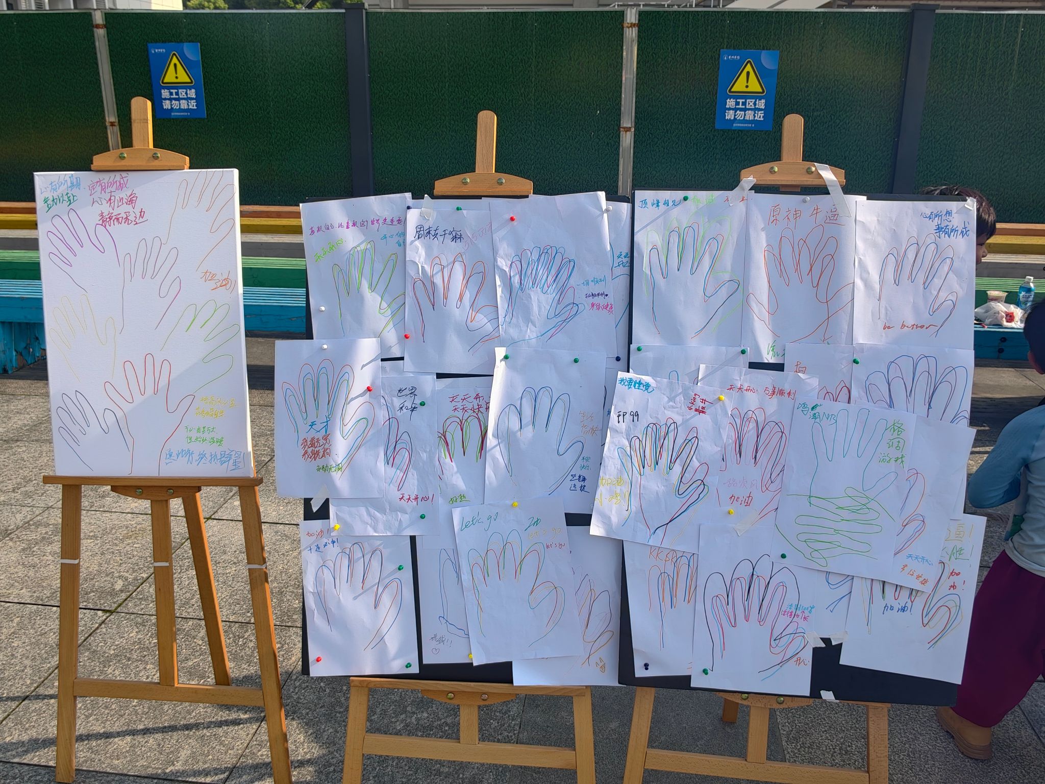 “击掌暖心创作”充满治愈与创意。小组协作绘制手掌轮廓,叠加成“纸上击掌”,并写下暖心寄语、成长心愿与治愈短句,搭配趣味插画,完成专属手印作品。每一幅创作都承载着心意与期许,成为青春成长的温暖印记。