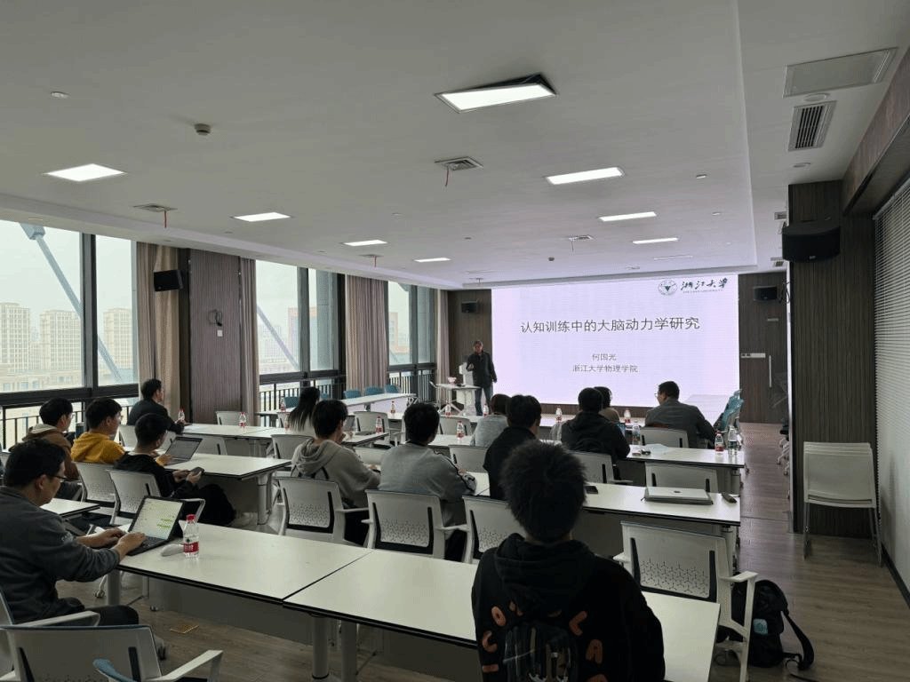 最后何国光副教授作题为“认知训练中的大脑动力学研究”的学术报告。何国光副教授从大脑功能网络拓扑结构出发,介绍了长期认知训练对静息态功能网络的影响。以社区同步为切入点,通过动力学建模方法解释了长期珠心算训练提升大脑视觉网络信息处理效率的机制。